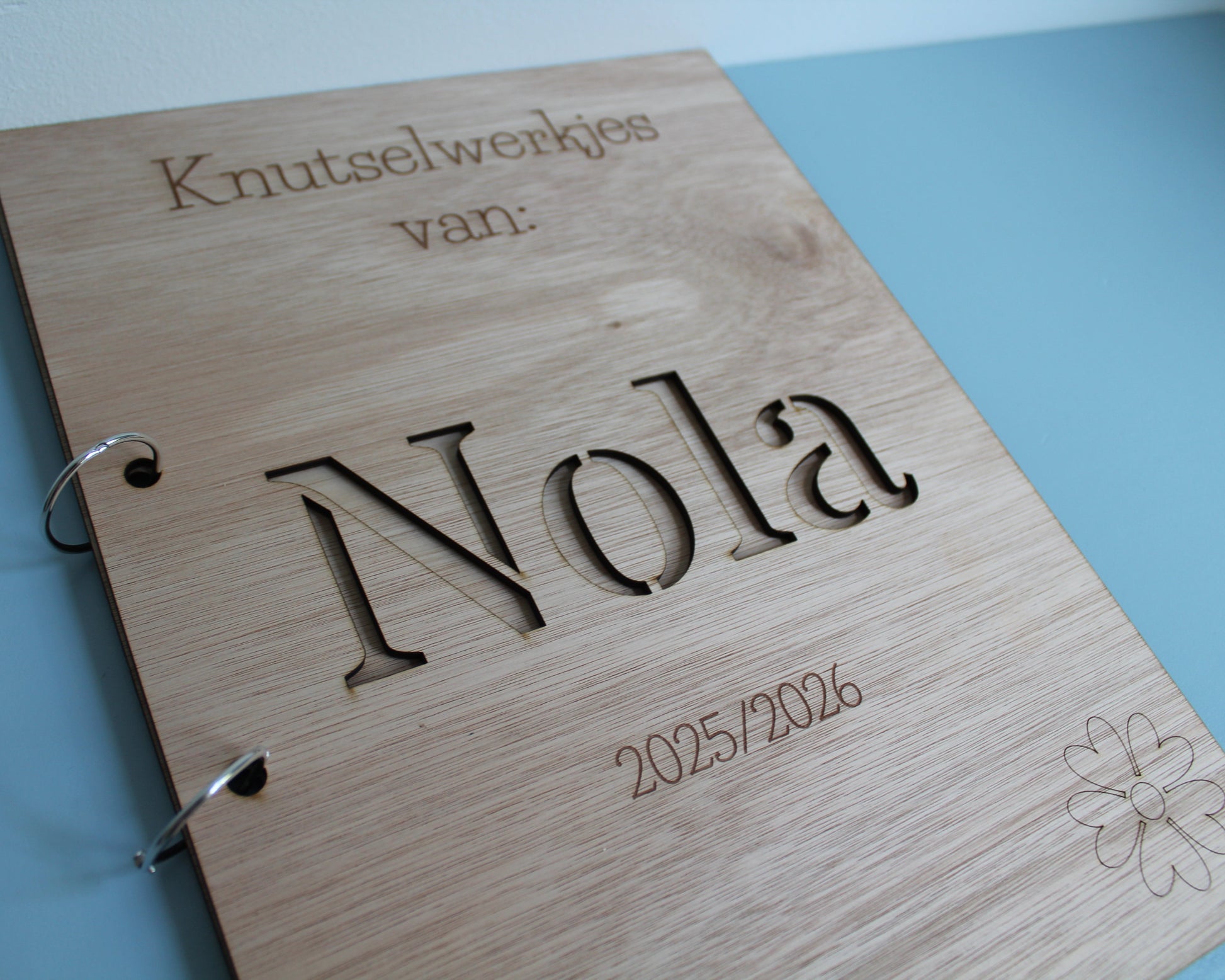 Een prachtige bewaarbundel om alle knutselwerkjes, tekeningen en schoolherinneringen van het jaar netjes bij elkaar te houden. De naam wordt met precisie uitgesneden op de voorkant, waardoor het een persoonlijk en uniek bewaarcadeau wordt.