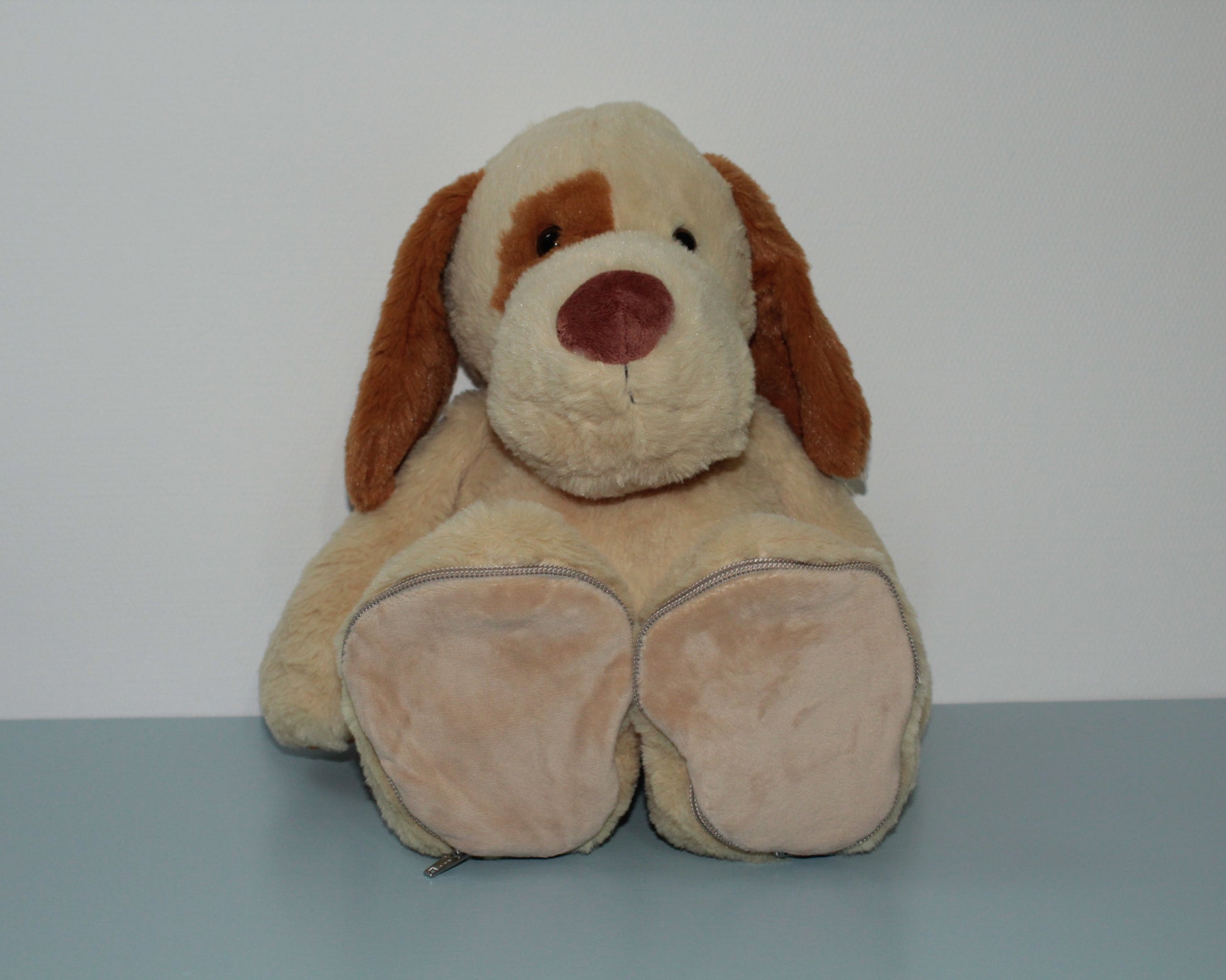 Wat deze hond extra bijzonder maakt? De verwisselbare zooltjes van de voetjes kunnen worden geborduurd met een naam, geboortedatum, of een persoonlijke boodschap naar keuze. Perfect als kraamcadeau, verjaardagscadeau of als blijvende herinnering aan een speciale dag.
